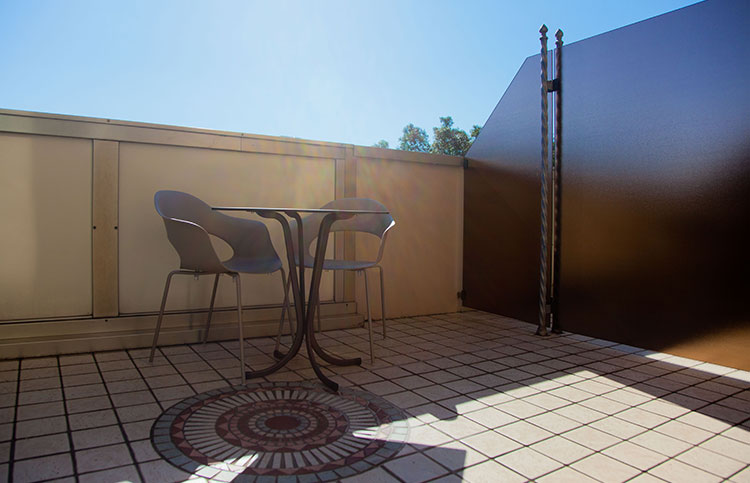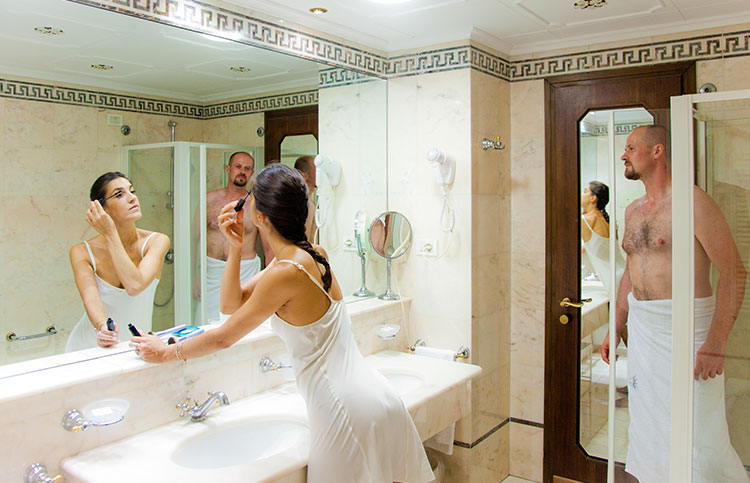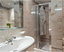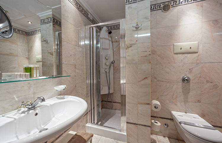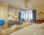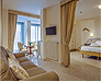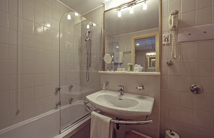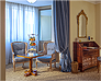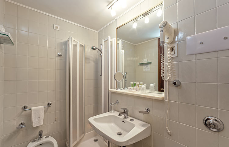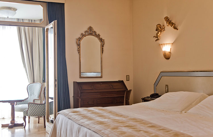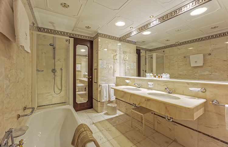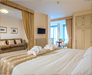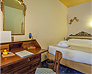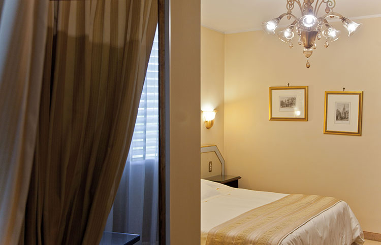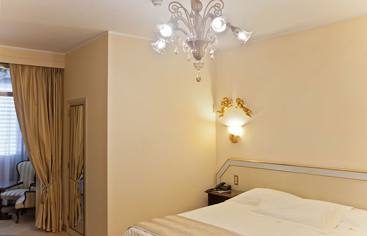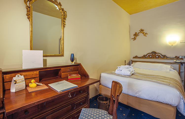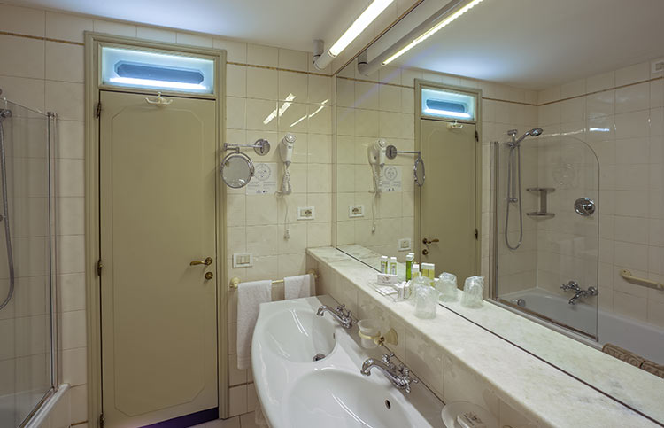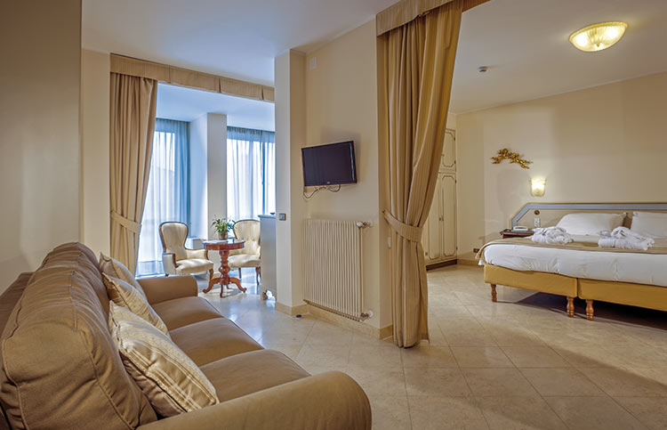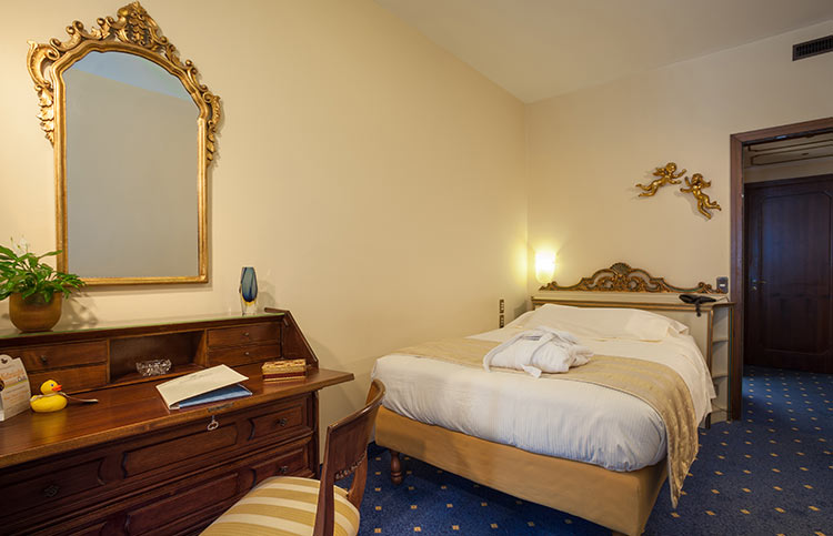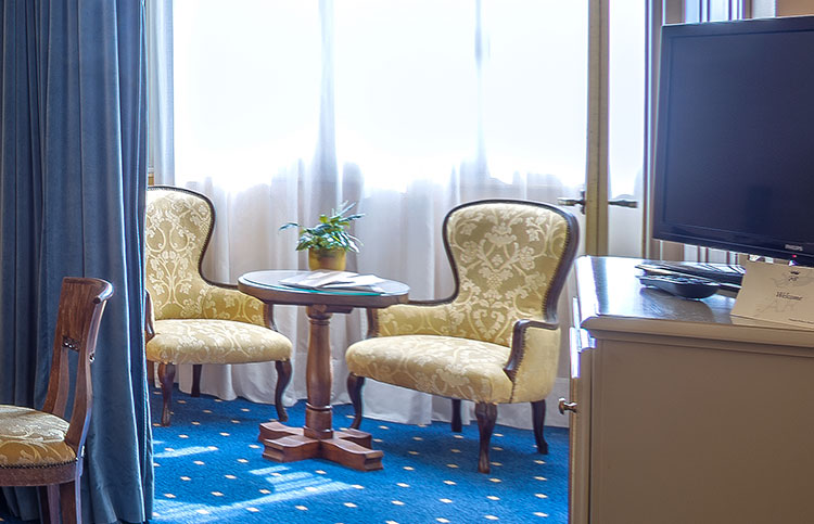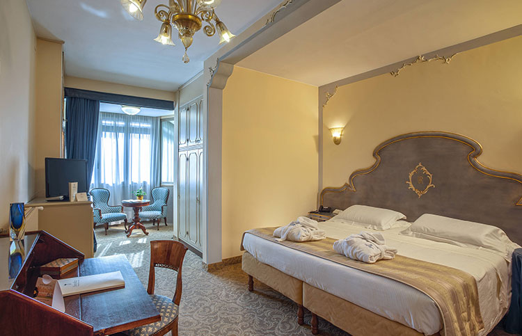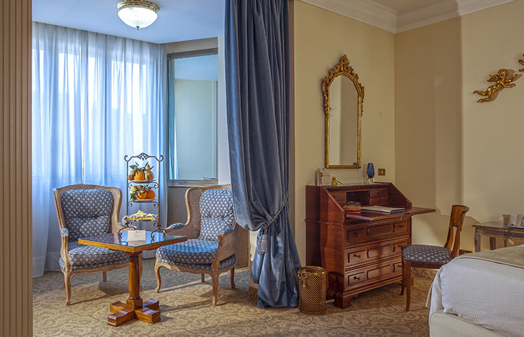White, gold and blue for a classic bedroom with a comfortable double bed, large and small pillows, more or less soft. Large and comfortable walk-in closet, the sitting room that looks at the sun in the morning, or, to the west, at the sunset. You can choose both a bathroom with shower or a bathroom with tub, there will be the possibility for some to have a connecting twin room and therefore enjoy the holiday with family or close friends.